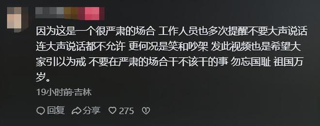 作者在评论区说了自己为什么把视频发上来,是因为工作人员在馆里多次提醒他们不能大声说话,保持严肃,希望这条视频能够让大家引以为戒,在这种场合应该庄重对待,勿忘国耻。